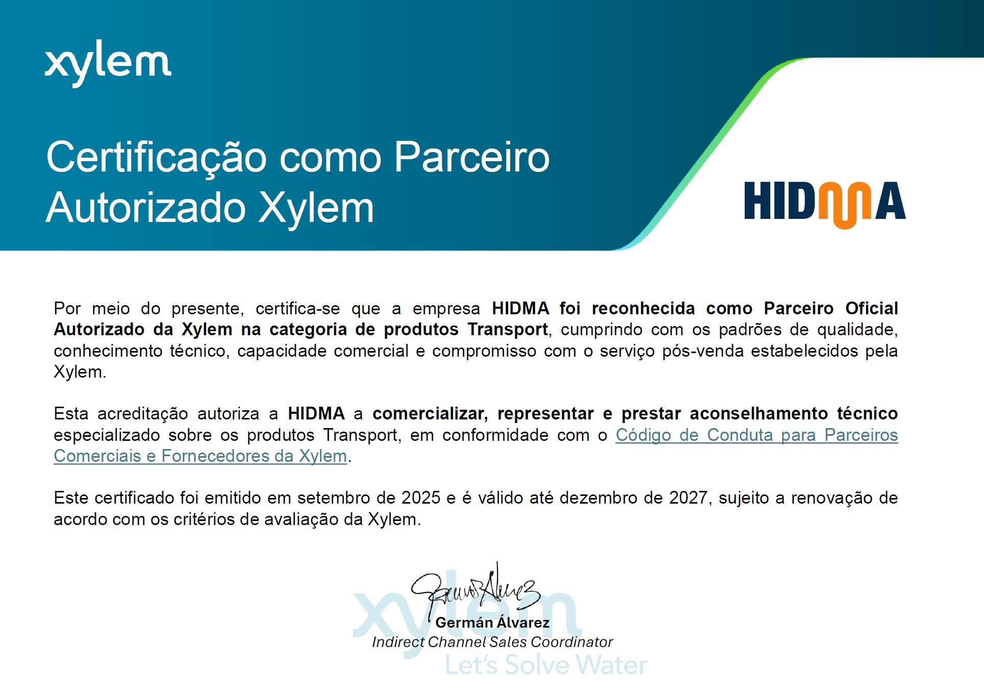 A HIDMA fruto do seu desempenho no mercado, capacidade técnica e inovação foi mais uma vez reconhecida pela XYLEM com um parceiro estratégico no mercado sendo selecionada como Parceiro Autorizado para o sector de negócio classificado como "TRANSPORT" que engloba as pretigiadas marcas FLYGT e LOWARA, entre outras.