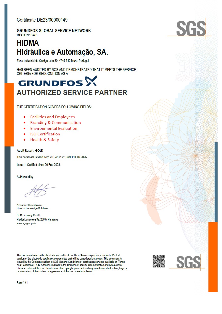 A HIDMA é certificada pela marca GRUNDFOS como entidade Parceira de Serviço Autorizado desde 2016